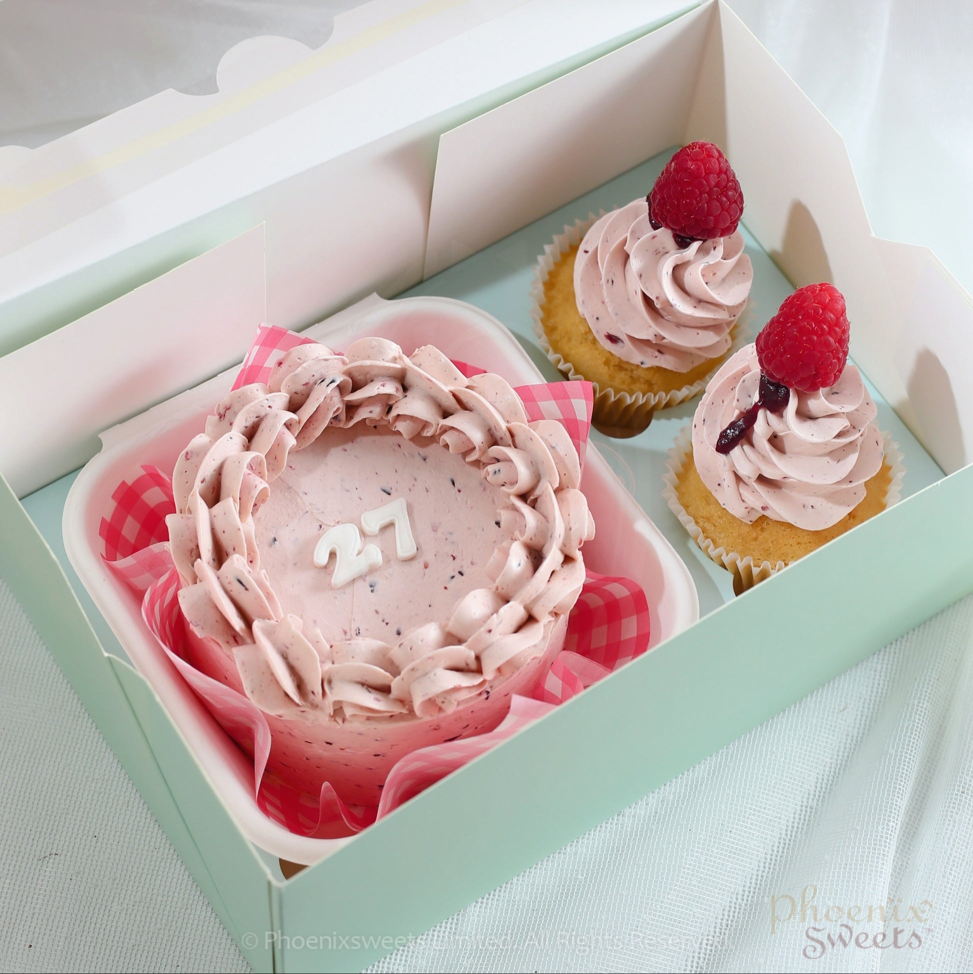 Each set includes a 4" diameter mini cake and 2 matching cupcakes, suitable to be shared by around 6 people. For the flavour of the cake and cupcakes, you may choose from: