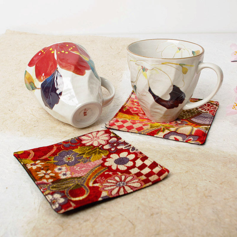 A pair of mugs in the colors of mountain tea flowers (red) and magnolias (white).