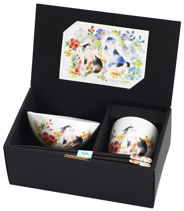 Hananeko Flower Cat Rice Bowl & Teacup Red Gift Set