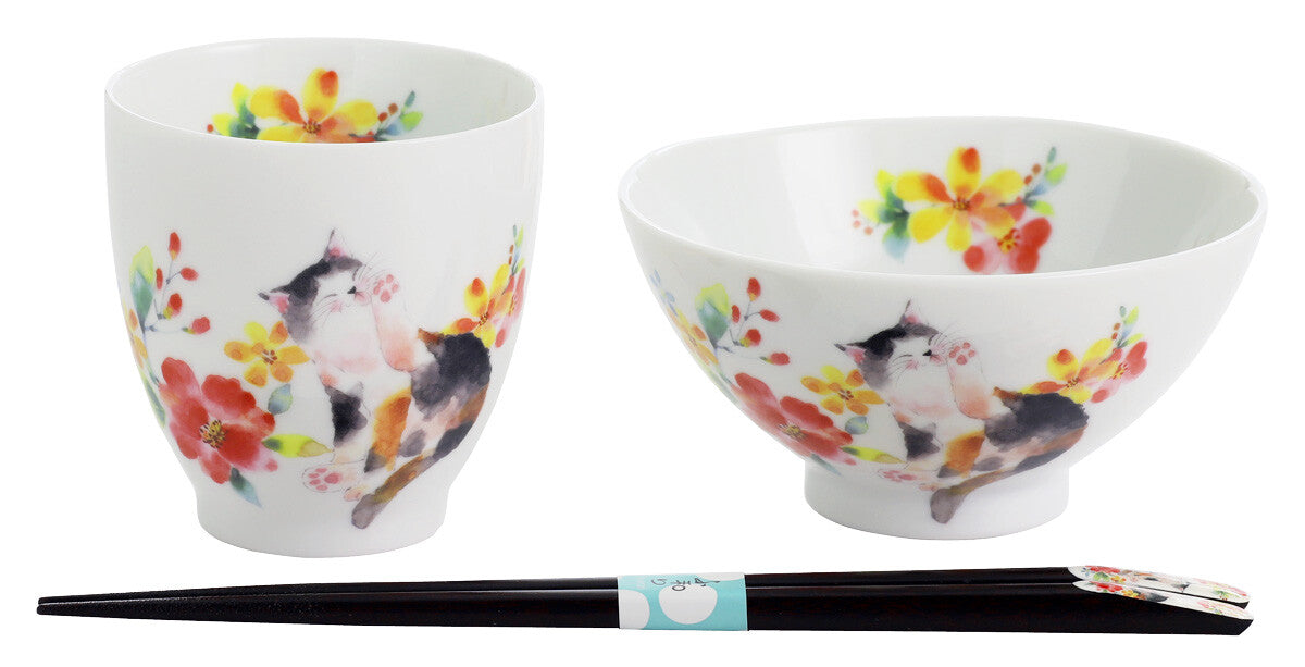 Hananeko Ceramic Mugs - Flower Cat Rice Bowl & Teacup Red Gift Set